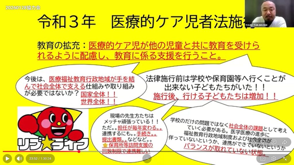 令和3年に医療的ケア児支援法が施行され、制度は整いつつありますが、福祉・教育・行政・地域の連携は十分とは言えません。18歳以降の支援の不足や、きょうだい児・ヤングケアラーの課題も残されています。現場任せではなく、地域全体で支える仕組みづくりが求められています。