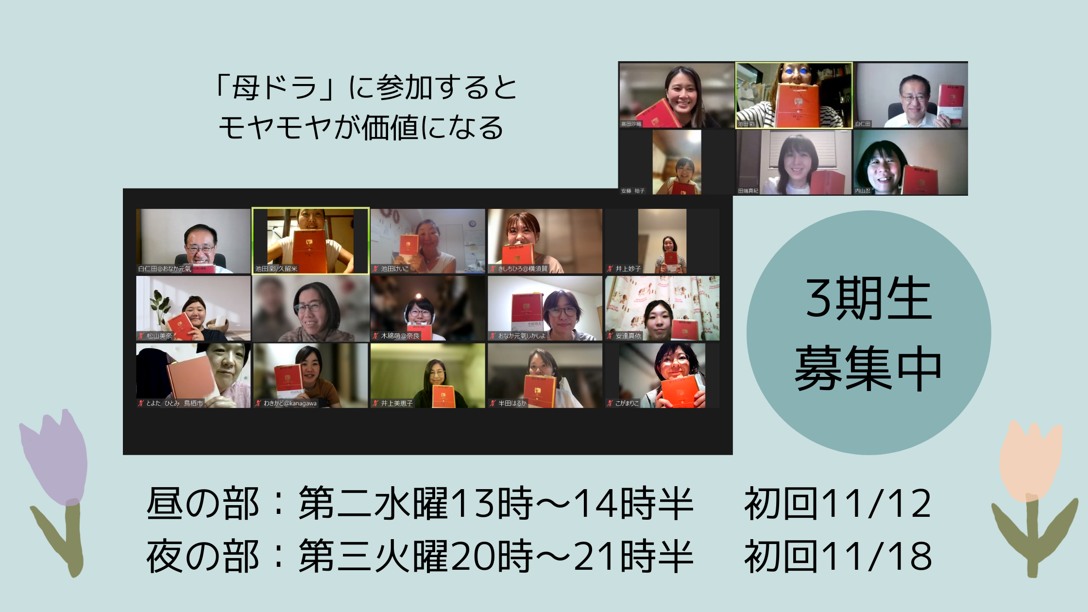 昼の部:第二水曜13時~14時半 初回は11/12
