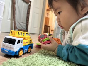息子が、トミカなんかで遊ぶ時、よく寝転がって遊ぶ。