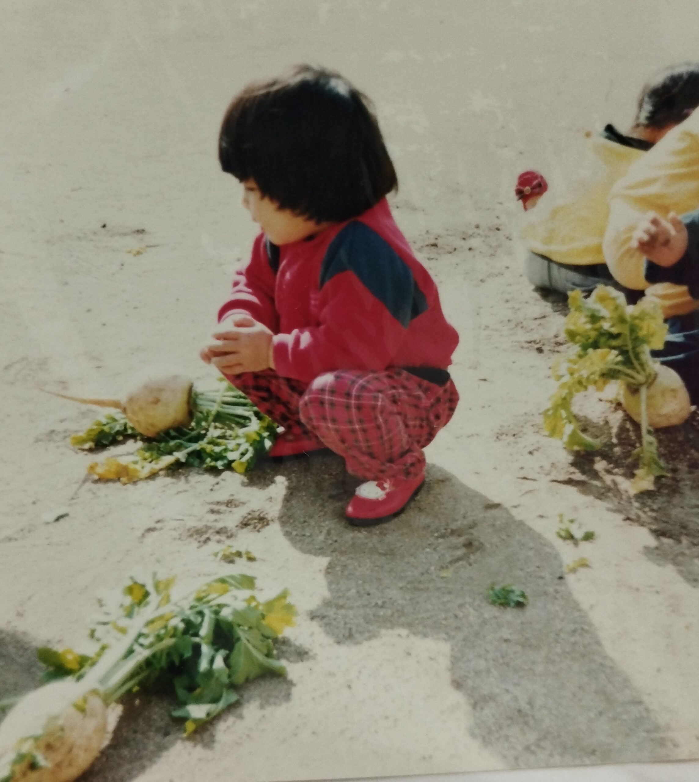 偶然にも保育園の行事で収穫したらしいお野菜、大根を園庭においている
