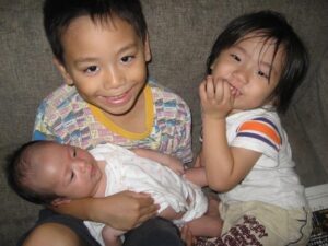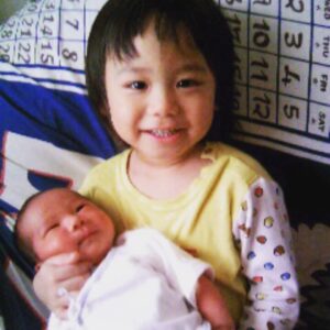 写真は弟が生まれてうれしくて初めて抱っこするウタ(2歳)と妹が生まれてうれしくて初めて抱っこするウタ(5歳)
