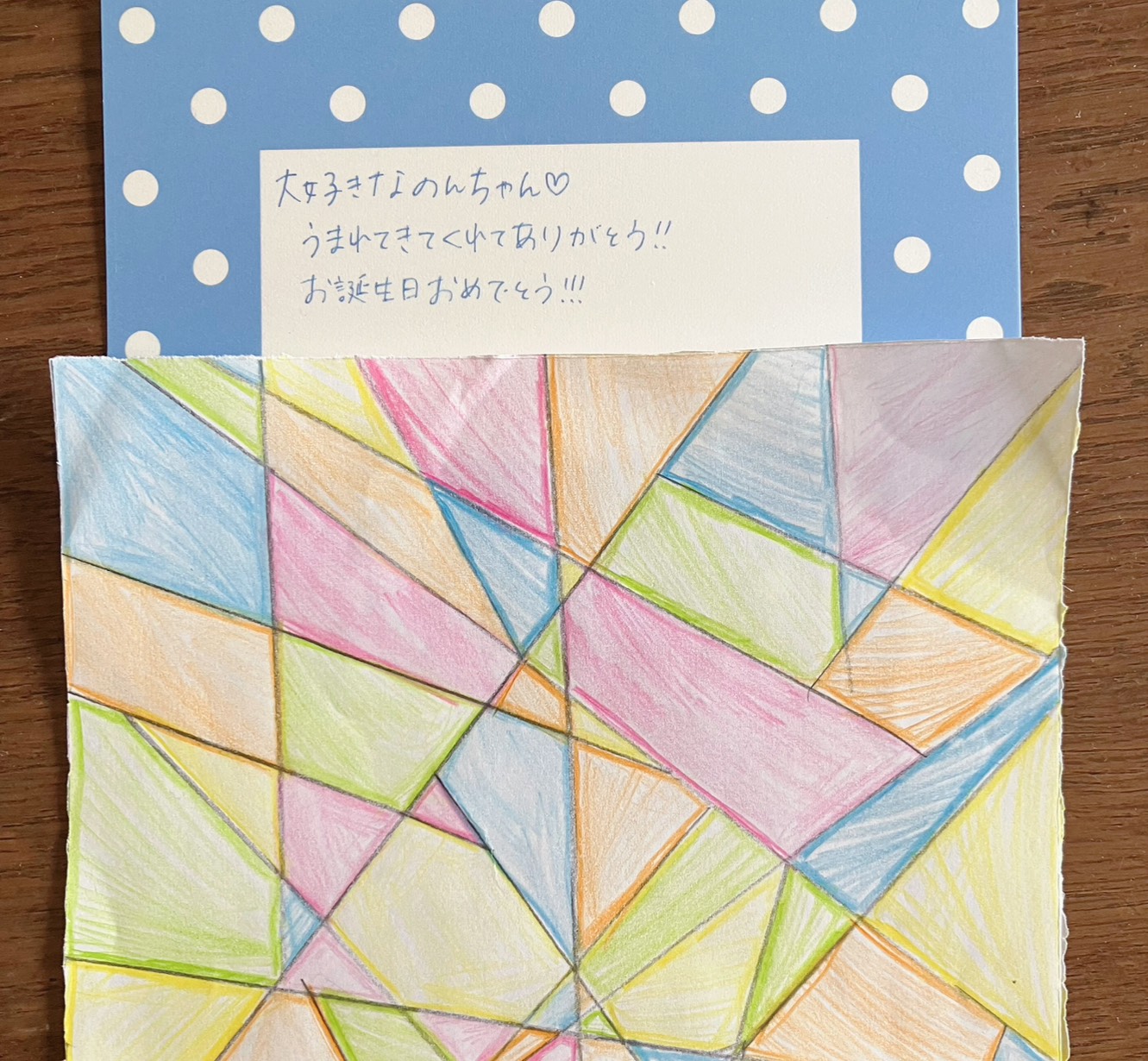 きれいな模様を様々な色鉛筆で塗った美しいカードをプレゼントしてくれました。