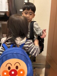 見ると、息子が娘に靴を履かせているではありませんか。まさに、先生のように!声かけバッチリです。