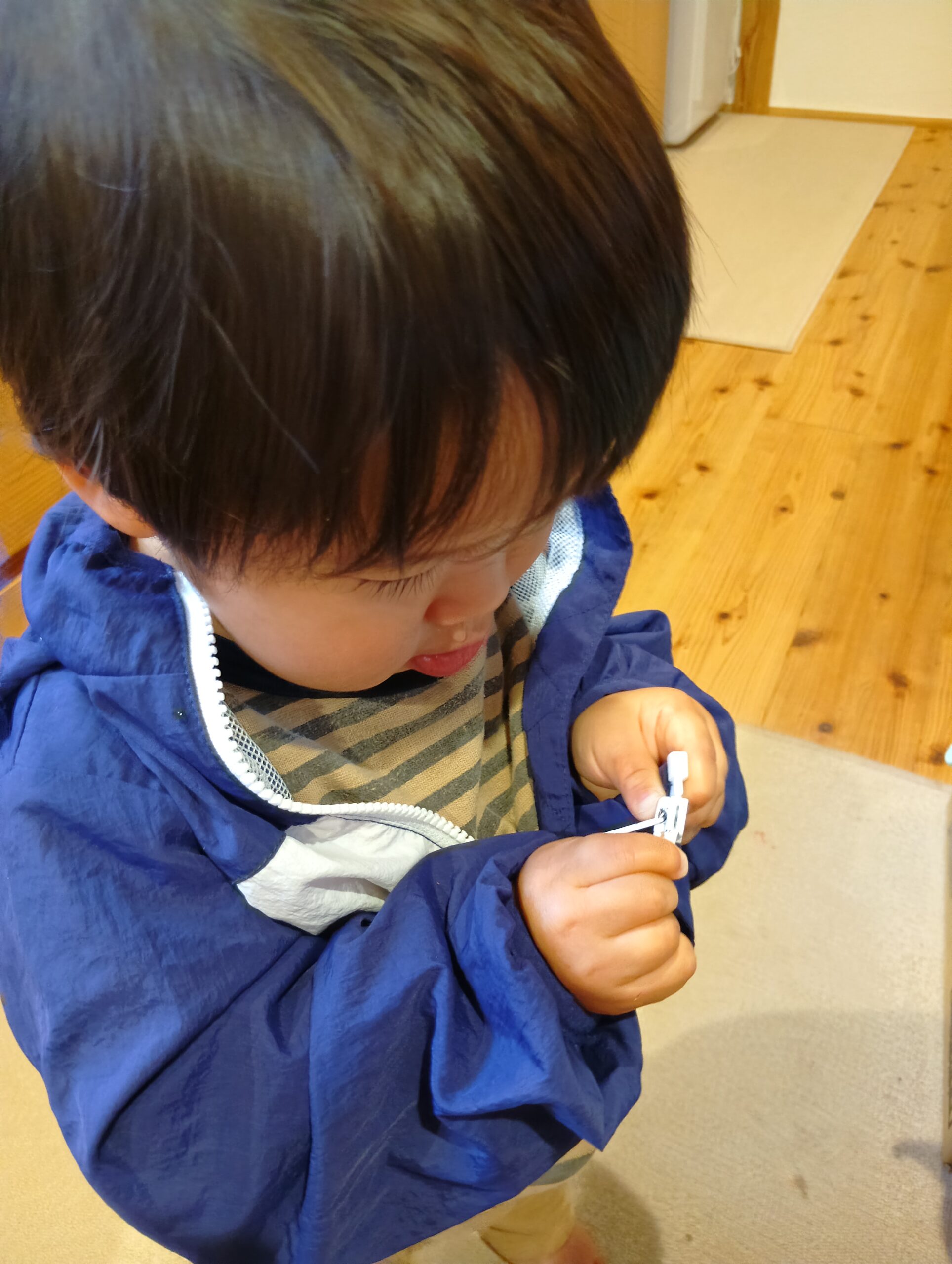 2歳になったばかりの息子は服のジッパーを閉めたいようだ。