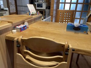 ご飯を食べながらふっと絵本の表紙が目に入るといいなぁと思い、飾る場所は食卓に。だけど気になってついつい取ることがないように、子どもの椅子からは離してみた。
