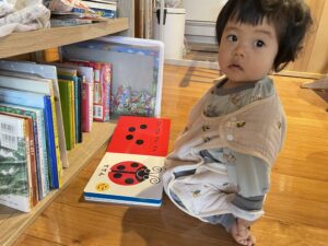 先に起きた次女は、何か察知したのかいきなり絵本を取り出して遊んでいた!かわいい!