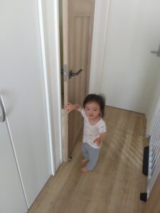 ソファや椅子に登って、テーブルの上に立ってしまったり。ドアノブに手が届くようになり、ドアを開けることもできるように。窓の鍵の開け方も分かったようです。