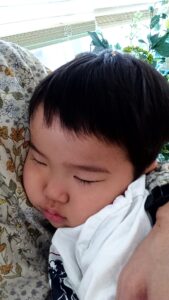 診察を待つ間に私の腕の中で眠りだす息子。