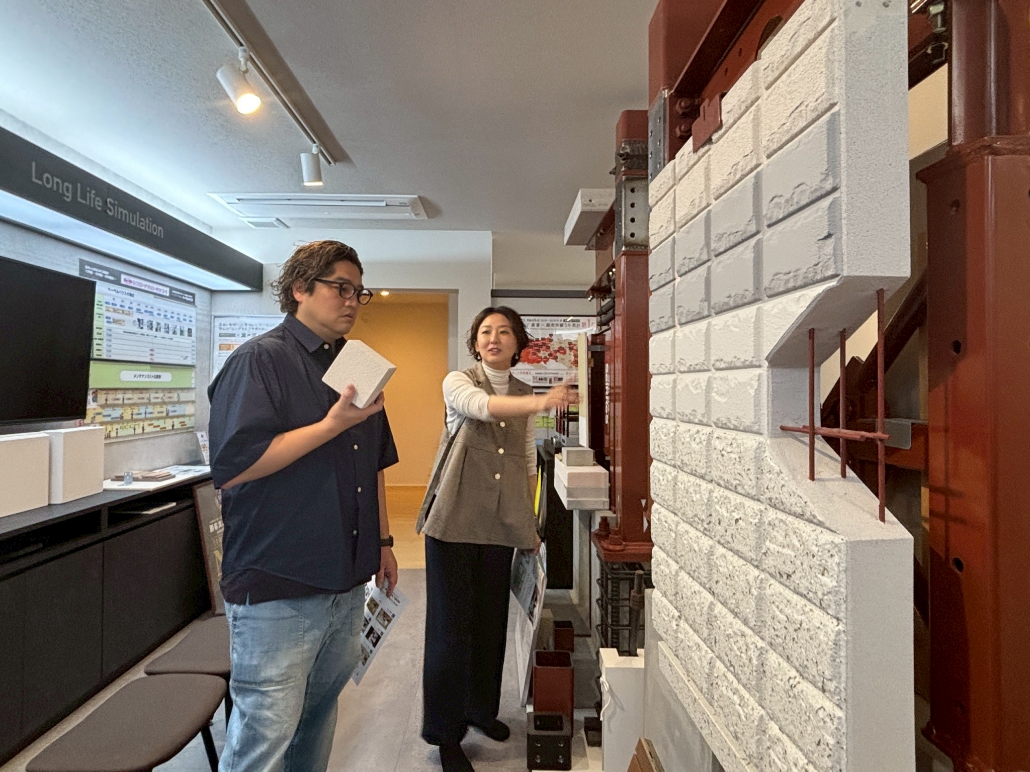 ヘーベルハウスの建物の構造や壁の材質など、いろいろ質問される高畠さんに、
