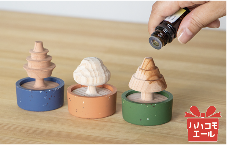 木の形や色、ポットの色柄、組み合わせもいろいろ。火も電源もいらない。
